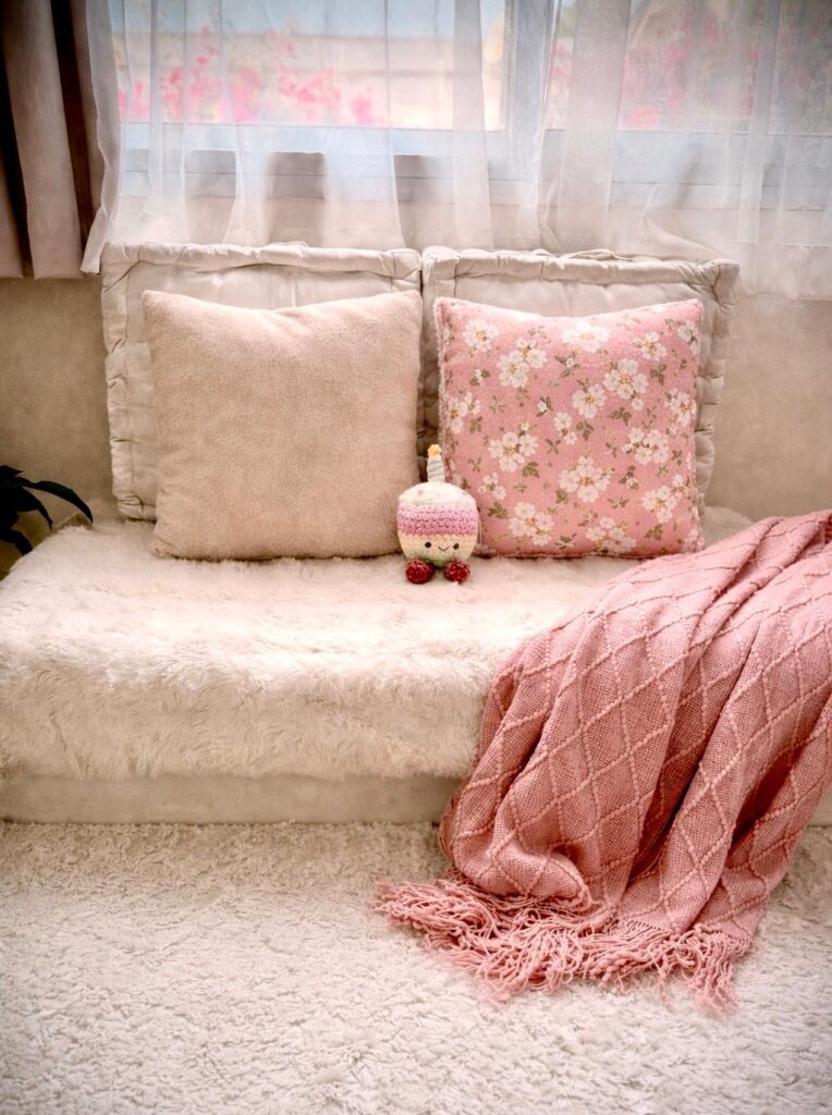 I used a white plush throw from TEMU that had been lying unused in the cupboard — and just placing it on the seating instantly made the space feel softer and more inviting 🤍