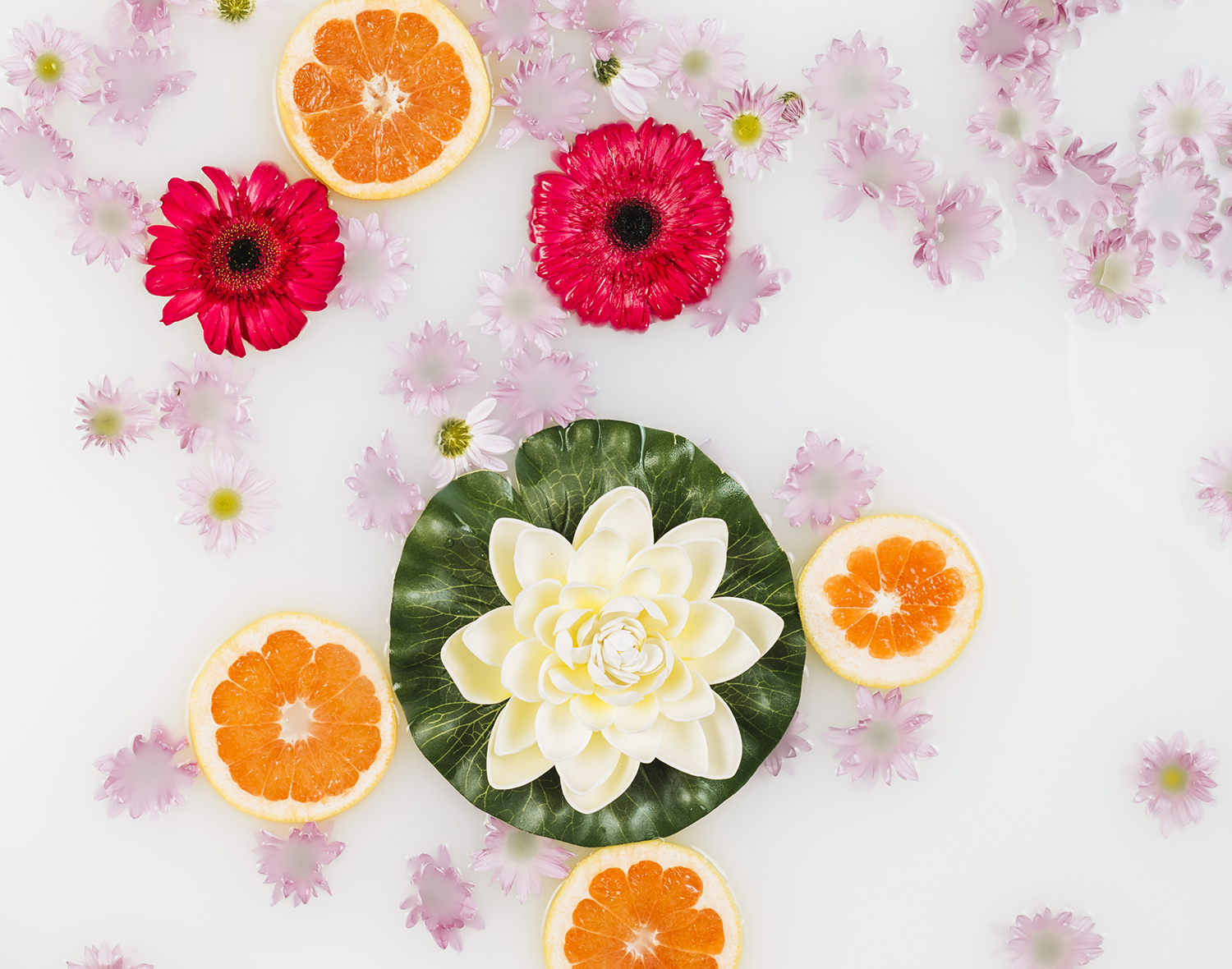 Add a vase of fresh blooms or a bowl of floating petals and tealights.