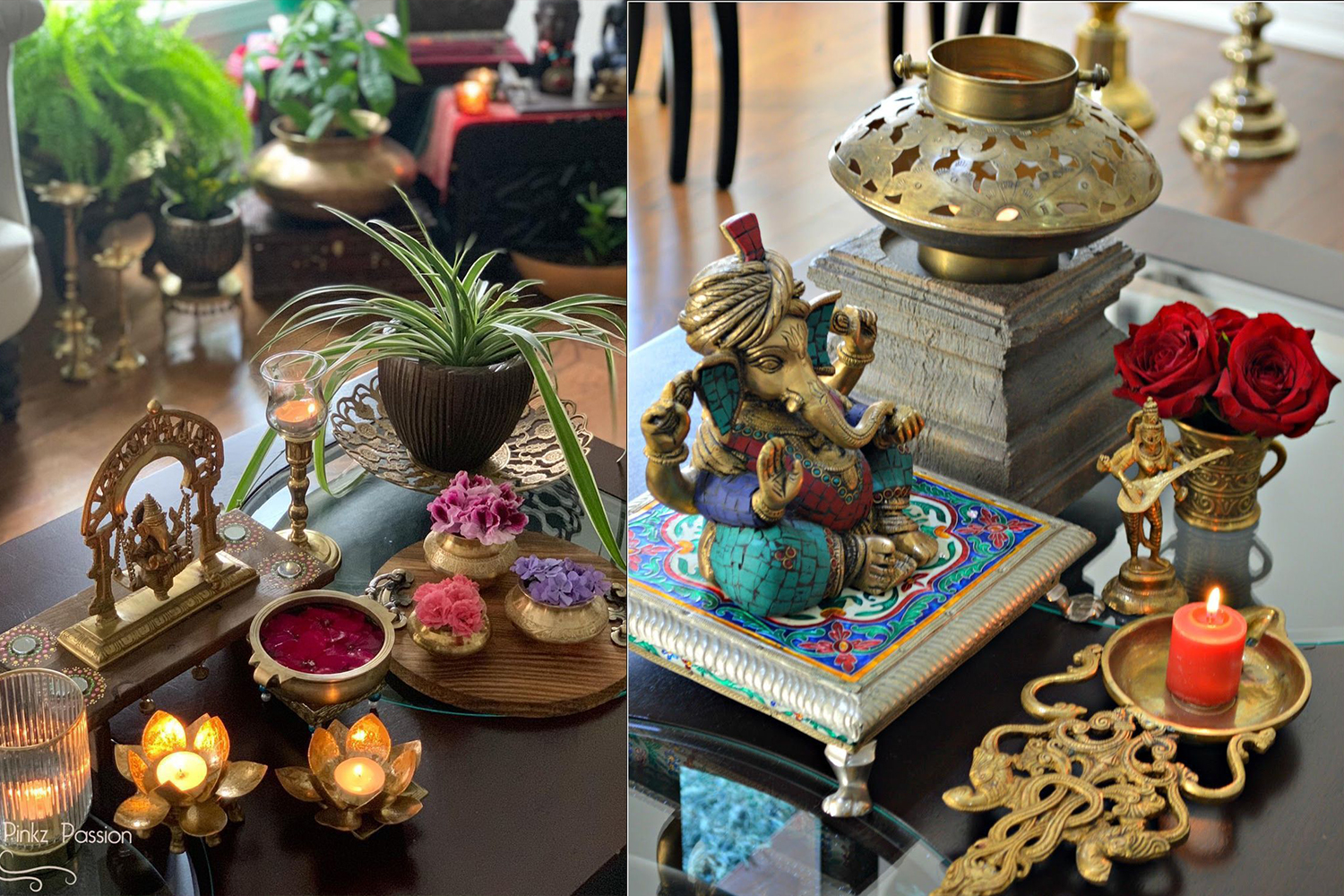 Start with a tray and add a mix of diyas, flowers, a small idol, and a candle.